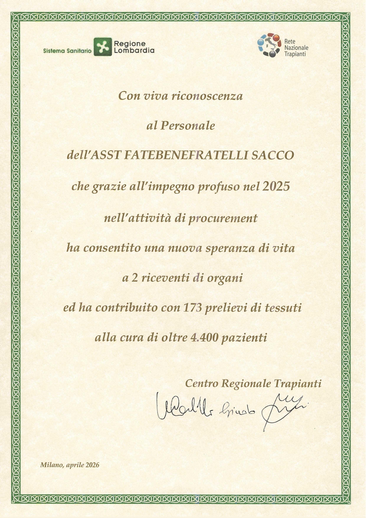 In occasione della Settimana Nazionale della Donazione di organi e tessuti, il Centro Regionale Trapianti Lombardia ha trasmesso un attestato di riconoscenza all’ASST FATEBENEFRATELLI SACCO per l’impegno profuso nel corso del 2025 nelle attività di procurement.